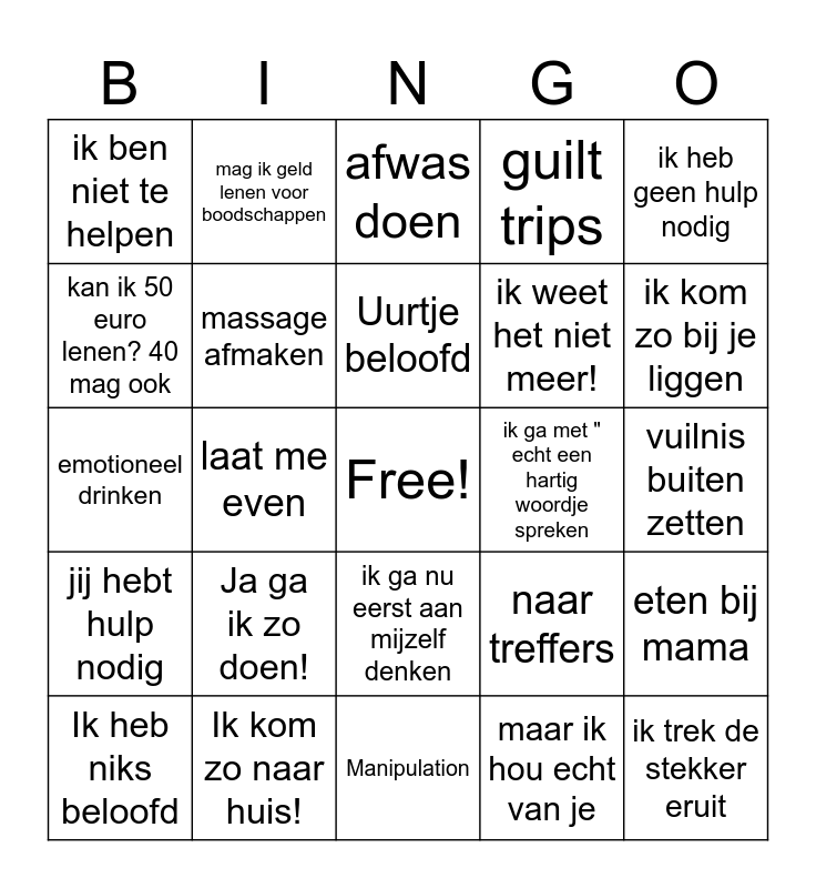 This bingo card has a free space and 24 words: Ja ga ik zo doen!, Ik kom zo naar huis!, Uurtje beloofd, Ik heb niks beloofd, ik heb geen hulp nodig, ik ben niet te helpen, kan ik 50 euro lenen? 40 mag ook, mag ik geld lenen voor boodschappen, ik ga met " echt een hartig woordje spreken, ik ga nu eerst aan mijzelf denken, ik weet het niet meer!, emotioneel drinken, naar treffers, eten bij mama, massage afmaken, maar ik hou echt van je, vuilnis buiten zetten, afwas doen, ik kom zo bij je liggen, laat me even, ik trek de stekker eruit, jij hebt hulp nodig, guilt trips and Manipulation.