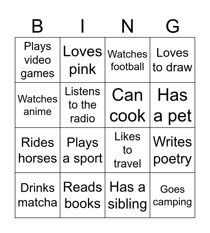 This bingo card has 16 words: Reads books, Writes poetry, Watches football, Plays video games, Rides horses, Loves pink, Likes to travel, Has a sibling, Watches anime, Listens to the radio, Drinks matcha, Loves to draw, Plays a sport, Has a pet, Can cook and Goes camping.