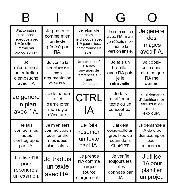 This bingo card has a free space and 40 words: Je demande à l’IA de m’aider à brainstormer., Je génère un plan avec l’IA., Je lui demande d’évaluer la qualité de mon texte., Je vérifie la structure de mon argumentation avec l’IA., Je traduis un texte avec l’IA., Je fais résumer un texte par l’IA., Je demande à l’IA des ouvrages de références sur une thématique., Je prétraite de gros volumes de données avec l’IA., Je génère des images avec l’IA., Je fais corriger mes fautes d'orthographe par l’IA., Je demande à l’IA d’améliorer mon style d’écriture., Je commence avec l’IA, mais je réécris moi-même la version finale., J’utilise l’IA pour planifier un projet., Je lui demande d’identifier mes erreurs et de me les expliquer., Je fais clarifier un texte ou un concept par l’IA., Je m’en sers comme coach pour rendre mes idées plus claires., L'IA joue un rôle (tuteur, client, jury) pour m’entraîner., J’automatise une tâche répétitive avec l’IA (mettre en forme ma bibliographie)., Je déclare mes usages de l’IA dans mon travail., Je reformule mes prompts et je dialogue avec l’IA pour mieux comprendre un sujet., Je demande à l’IA de créer des exemples pour m’exercer., Je vérifie toujours les infos données par l’IA., Je fais un brouillon avec l’IA puis je le retravaille., Je m'entraine à un entretien d'embauche avec l'IA, Je compare la réponse de l’IA avec mes sources pour éviter ses biais et hallucinations., J’ai déjà utilisé l’IA pour rédiger un mail banal (ex. remerciement)., Je rédige mon mémoire avec ChatGPT., Je laisse l’IA écrire un texte entier à ma place., Je fais faire mes calculs à l’IA sans les comprendre., J’ai demandé à l’IA de coder à ma place., Je fais résoudre un problème complexe par l’IA., J’utilise l’IA pour répondre à un examen., J’ai déjà donné trop d’infos perso à une IA., J’ai déjà copié-collé un gros bloc de cours dans ChatGPT., Je copie-colle sans relire ce que l’IA me donne., Je prends l’IA comme unique source d’arguments., Je fais reformuler par l’IA un texte qui n’est pas le mien., Je soumets un travail que je ne comprends pas., Je présente comme mien un texte généré par l’IA. and Je demande à l’IA de résumer mon cours au lieu de le lire..