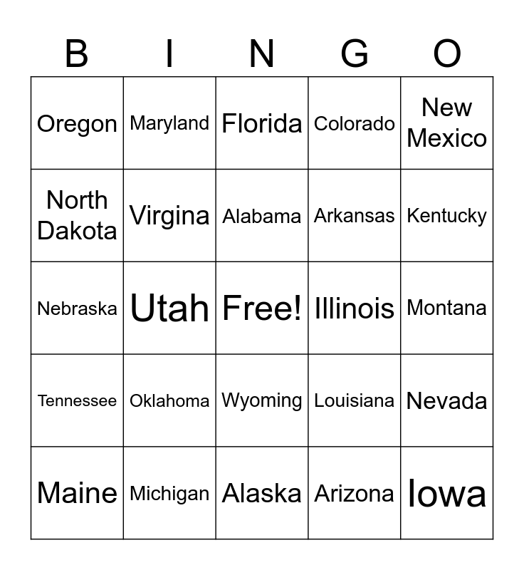 This bingo card has a free space and 34 words: Texas, Arizona, California, Kansas, Tennessee, Virgina, New Mexico, Maine, Maryland, Wisconsin, Alabama, Florida, Georgia, Idaho, Illinois, Kentucky, Michigan, Nebraska, Oklahoma, Louisiana, Wyoming, South Carolina, Oregon, Montana, Alaska, Iowa, Colorado, Missouri, Arkansas, North Dakota, South Dakota, Utah, Nevada and Kentucky.