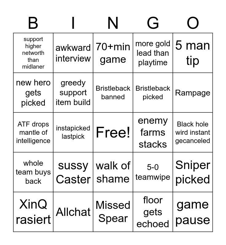 This bingo card has a free space and 35 words: fountain dive, roshan throws Player, aegis steal, greedy support item build, walk of shame, more gold lead than playtime, new hero gets picked, first blood before 0:00, Bristleback banned, midlaner solo-killed during laning phase, ATF drops mantle of intelligence, 5 man tip, less than 10 kill before 30min, Malrine does lane shenanigans, support higher networth than midlaner, enemy farms stacks, floor gets echoed, instapicked lastpick, whole team buys back, game pause, 5-0 teamwipe, XinQ rasiert, Sniper picked, Allchat, 70+min game, Rampage, dummer dieback, Player killed by tormentor, Bristleback picked, Black hole wird instant gecanceled, Timber win, Missed Spear, sussy Caster, awkward interview and Chinese BKB.