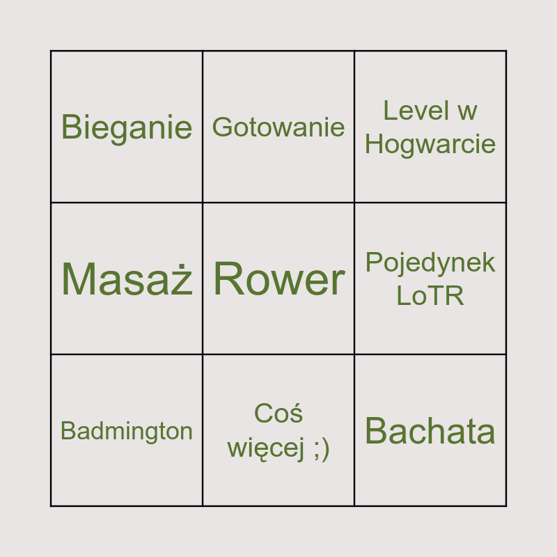 This bingo card has a free space and 8 words: Pojedynek LoTR, Level w Hogwarcie, Gotowanie, Badmington, Bieganie, Bachata, Masaż and Coś więcej ;).