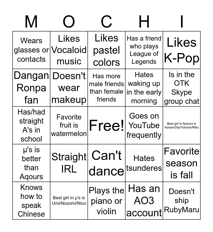 This bingo card has a free space and 24 words: Straight IRL, Best girl in μ's is Umi/Nozomi/Nico, Has more male friends than female friends, Knows how to speak Chinese, Likes K-Pop, Wears glasses or contacts, Dangan Ronpa fan, Likes Vocaloid music, Goes on YouTube frequently, Can't dance, Hates waking up in the early morning, Has/had straight A's in school, Hates tsunderes, Favorite season is fall, Doesn't wear makeup, Has an AO3 account, Best girl in Aqours is Kanan/Dia/Yohane/Riko, Likes pastel colors, Is in the OTK Skype group chat, Favorite fruit is watermelon, Doesn't ship RubyMaru, μ's is better than Aqours, Has a friend who plays League of Legends and Plays the piano or violin.
