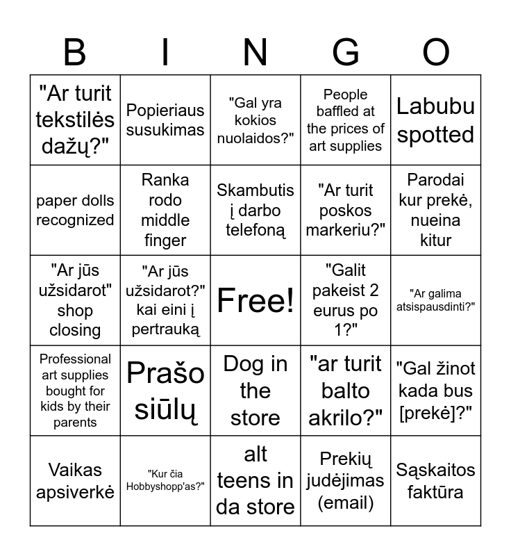 This bingo card has a free space and 24 words: Prašo siūlų, "Kur čia Hobbyshopp'as?", Skambutis į darbo telefoną, Vaikas apsiverkė, Labubu spotted, "Ar turit tekstilės dažų?", paper dolls recognized, Popieriaus susukimas, "Galit pakeist 2 eurus po 1?", Dog in the store, "Ar turit poskos markeriu?", "Ar jūs užsidarot" shop closing, "ar turit balto akrilo?", "Gal žinot kada bus [prekė]?", Ranka rodo middle finger, Prekių judėjimas (email), "Ar galima atsispausdinti?", "Gal yra kokios nuolaidos?", Parodai kur prekė, nueina kitur, "Ar jūs užsidarot?" kai eini į pertrauką, Sąskaitos faktūra, Professional art supplies bought for kids by their parents, People baffled at the prices of art supplies and alt teens in da store.