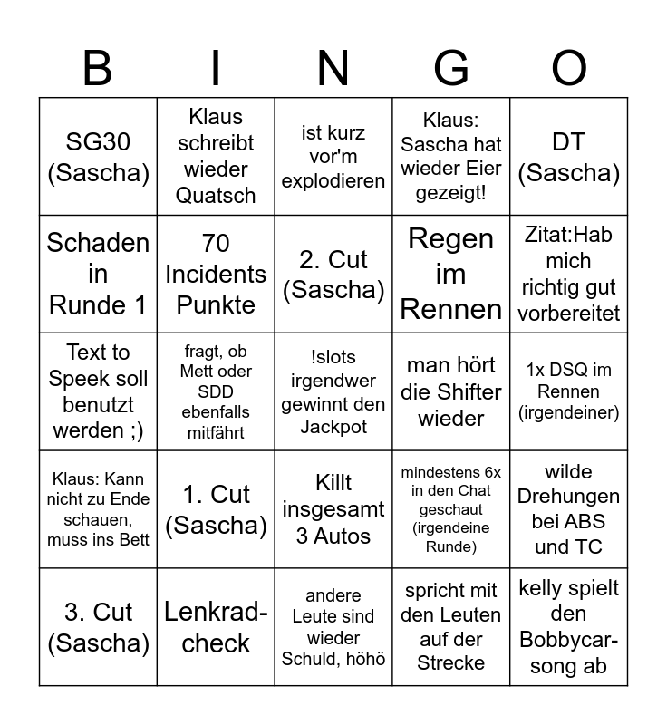 This bingo card has a free space and 24 words: 1. Cut (Sascha), Lenkrad-check, 2. Cut (Sascha), 3. Cut (Sascha), DT (Sascha), SG30 (Sascha), Schaden in Runde 1, Klaus schreibt wieder Quatsch, man hört die Shifter wieder, Killt insgesamt 3 Autos, Regen im Rennen, Text to Speek soll benutzt werden ;), mindestens 6x in den Chat geschaut (irgendeine Runde), wilde Drehungen bei ABS und TC, 70 Incidents Punkte, spricht mit den Leuten auf der Strecke, 1x DSQ im Rennen (irgendeiner), ist kurz vor'm explodieren, Zitat:Hab mich richtig gut vorbereitet, fragt, ob Mett oder SDD ebenfalls mitfährt, kelly spielt den Bobbycar-song ab, Klaus: Kann nicht zu Ende schauen, muss ins Bett, Klaus: Sascha hat wieder Eier gezeigt! and andere Leute sind wieder Schuld, höhö.