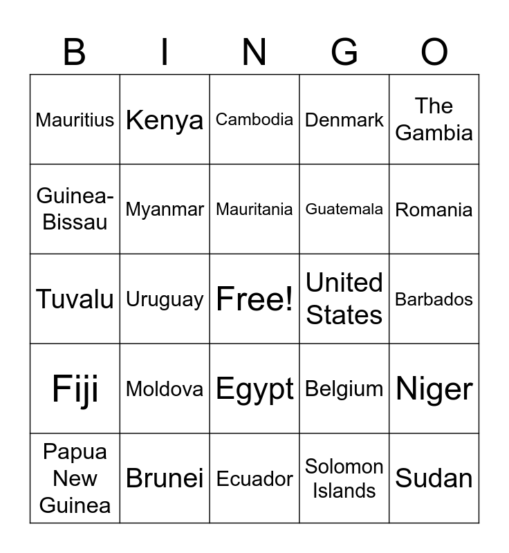 This bingo card has a free space and 193 words: Afghanistan, Albania, Algeria, Andorra, Angola, Antigua and Barbuda, Argentina, Armenia, Australia, Austria, Azerbaijan, The Bahamas, Bahrain, Bangladesh, Barbados, Belarus, Belgium, Belize, Benin, Bhutan, Bolivia, Bosnia and Herzegovina, Botswana, Brazil, Brunei, Bulgaria, Burkina Faso, Burundi, Cambodia, Cameroon, Canada, Cape Verde, Central African Republic, Chad, Chile, China, Colombia, Comoros, Democratic Republic of the Congo, Republic of the Congo, Costa Rica, Croatia, Cuba, Cyprus, Czech Republic, Denmark, Djibouti, Dominica, Dominican Republic, Ecuador, Egypt, El Salvador, Equatorial Guinea, Eritrea, Estonia, Eswatini, Ethiopia, Fiji, Finland, France, Gabon, The Gambia, Georgia (country), Germany, Ghana, Greece, Grenada, Guatemala, Guinea, Guinea-Bissau, Guyana, Haiti, Honduras, Hungary, Iceland, India, Indonesia, Iran, Iraq, Republic of Ireland, Israel, Italy, Ivory Coast, Jamaica, Japan, Jordan, Kazakhstan, Kenya, Kiribati, Kuwait, Kyrgyzstan, Laos, Latvia, Lebanon, Lesotho, Liberia, Libya, Liechtenstein, Lithuania, Luxembourg, Madagascar, Malawi, Malaysia, Maldives, Mali, Malta, Marshall Islands, Mauritania, Mauritius, Mexico, Federated States of Micronesia, Moldova, Monaco, Mongolia, Montenegro, Morocco, Mozambique, Myanmar, Namibia, Nauru, Nepal, Netherlands, New Zealand, Nicaragua, Niger, Nigeria, North Korea, North Macedonia, Norway, Oman, Pakistan, Palau, Panama, Papua New Guinea, Paraguay, Peru, Philippines, Poland, Portugal, Qatar, Romania, Russia, Rwanda, Saint Kitts and Nevis, Saint Lucia, Saint Vincent and the Grenadines, Samoa, San Marino, São Tomé and Príncipe, Saudi Arabia, Senegal, Serbia, Seychelles, Sierra Leone, Singapore, Slovakia, Slovenia, Solomon Islands, Somalia, South Africa, South Korea, South Sudan, Spain, Sri Lanka, Sudan, Suriname, Sweden, Switzerland, Syria, Tajikistan, Tanzania, Thailand, Timor-Leste, Togo, Tonga, Trinidad and Tobago, Tunisia, Turkey, Turkmenistan, Tuvalu, Uganda, Ukraine, United Arab Emirates, United Kingdom, United States, Uruguay, Uzbekistan, Vanuatu, Venezuela, Vietnam, Yemen, Zambia and Zimbabwe.