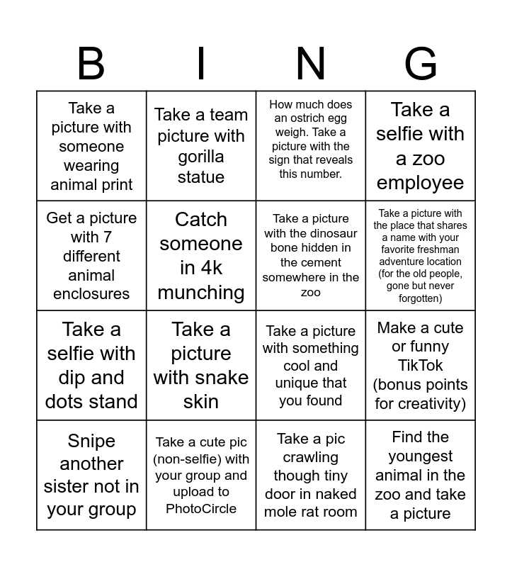 This bingo card has 16 words: Take a cute pic (non-selfie) with your group and upload to PhotoCircle, Make a cute or funny TikTok (bonus points for creativity), How much does an ostrich egg weigh. Take a picture with the sign that reveals this number., Take a picture with someone wearing animal print, Take a selfie with dip and dots stand, Take a team picture with gorilla statue, Take a picture with something cool and unique that you found, Take a pic crawling though tiny door in naked mole rat room, Get a picture with 7 different animal enclosures, Catch someone in 4k munching, Snipe another sister not in your group, Take a selfie with a zoo employee, Take a picture with snake skin, Take a picture with the place that shares a name with your favorite freshman adventure location (for the old people, gone but never forgotten), Take a picture with the dinosaur bone hidden in the cement somewhere in the zoo and Find the youngest animal in the zoo and take a picture.
