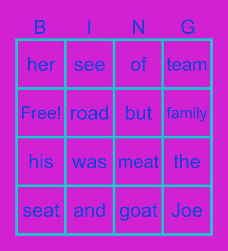 This bingo card has 16 words: and, the, of, her, his, see, meat, goat, Free!, road, seat, team, was, family, but and Joe.