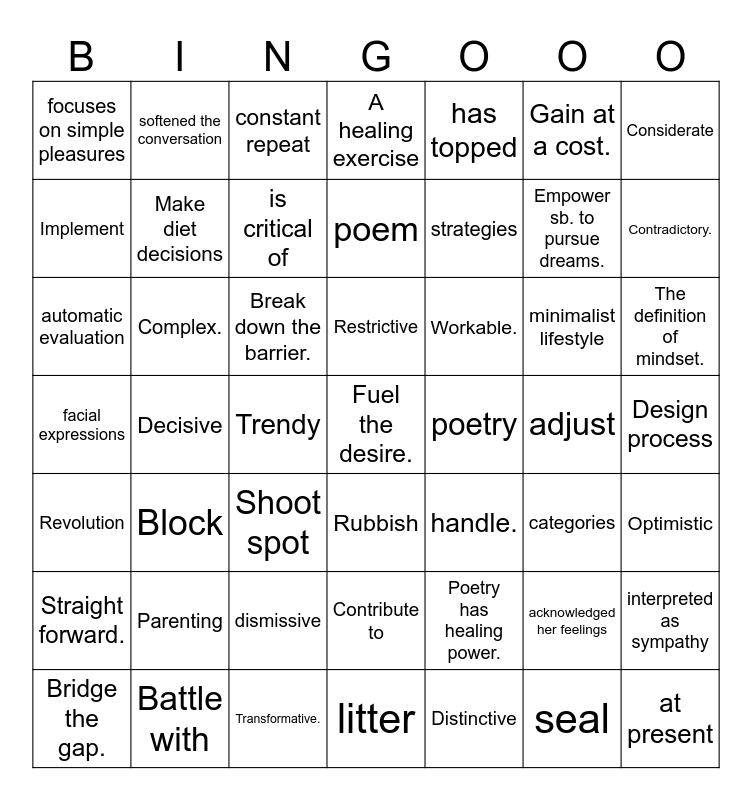 This bingo card has 69 words: visual feedback., automatic evaluation, Eye Contact, categories, facial expressions, instructors., A healing exercise, interpreted as sympathy, has topped, at present, minimalist lifestyle, Transformative., focuses on simple pleasures, constant repeat, consume, strategies, Restrictive, Make diet decisions, Costly., Complex., Contradictory., Workable., is critical of, adjust, Block, Contribute to, Parenting, dismissive, Trendy, acknowledged her feelings, softened the conversation, Battle with, a mountain of, Deal with, handle., Rubbish, litter, Revolution, Gain at a cost., Fuel the desire., Break down the barrier., Empower sb. to pursue dreams., Design process, Work principle, Theoretical foundation, The definition of mindset., Optimistic, Distinctive, Distinguished, Considerate, Implement, Worthless, Shoot spot, Decisive, Team up with, Proper time management, Comforting, Poet, poetry, poem, Simplify complex concepts, Decline, Bridge the gap., Straight forward., Poetry has healing power., A poetic mindset, seal, Deserve notice. and Interactive.
