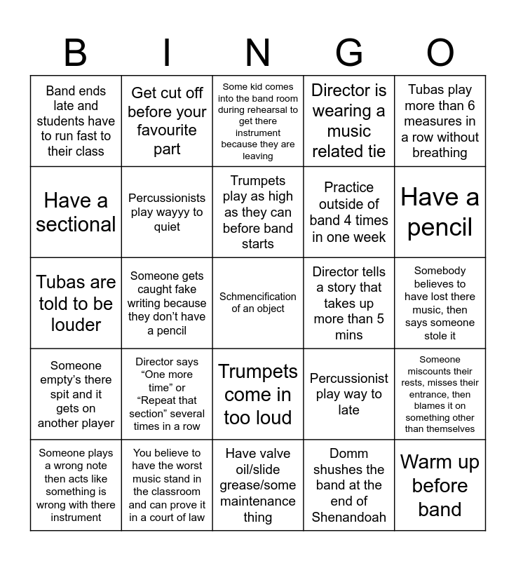 This bingo card has 36 words: A Clarinet squeaks and the band director gives them “The Look”, Someone continues to play 4 measures after the band director cut off, Somebody pretends to write on there music when the director told them to, Percussionists play wayyy to quiet, Percussionist play way to late, Someone empty’s there spit and it gets on another player, Trumpets play as high as they can before band starts, A sax plays careless whisper, Tubas play more than 6 measures in a row without breathing, Director yells out to check the key signature for the 3rd time in a row, Someone gets caught fake writing because they don’t have a pencil, Director is wearing a music related tie, Director stands in disappointed silence, Director tells a story that takes up more than 5 mins, Have a pencil, Band ends late and students have to run fast to their class, Warm up before band, Director says “One more time” or “Repeat that section” several times in a row, Schmencification of an object, Some kid comes into the band room during rehearsal to get there instrument because they are leaving, Somebody believes to have lost there music, then says someone stole it, Someone miscounts their rests, misses their entrance, then blames it on something other than themselves, You believe to have the worst music stand in the classroom and can prove it in a court of law, Someone plays a wrong note then acts like something is wrong with there instrument, Have valve oil/slide grease/some maintenance thing, Get cut off before your favourite part, Tubas are told to be louder, Tune with your section, Practice outside of band 4 times in one week, Have a sectional, Tubas play seven nation army, Howard talks about the time someone dropped their cymbal while marching, Domm shushes the band at the end of Shenandoah, Trumpets come in too loud, Cass forgets to make an important announcement and Trombone hits someone with their slide.