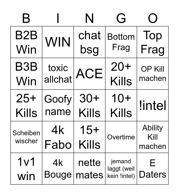 This bingo card has a free space and 24 words: 4k Fabo, 4k Bouge, ACE, 1v1 win, Top Frag, B2B Win, B3B Win, WIN, 10+ Kills, 15+ Kills, 20+ Kills, 25+ Kills, Overtime, Ability Kill machen, toxic allchat, jemand laggt (weil kein !intel), !intel, chat bsg, OP Kill machen, Goofy name, E Daters, Scheiben wischer, Bottom Frag and nette mates.