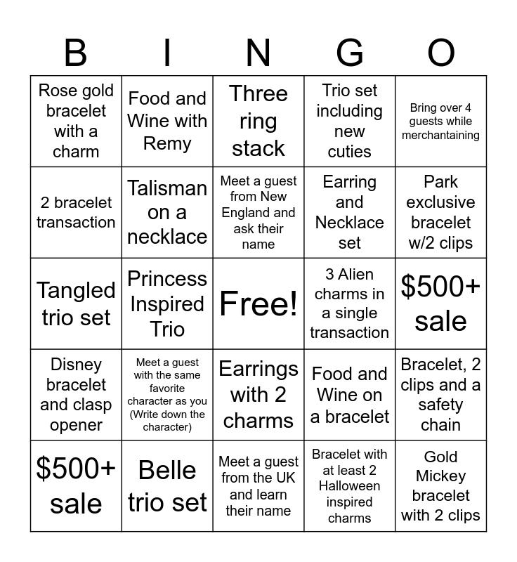 This bingo card has a free space and 31 words: Meet a guest from the UK and learn their name, Meet a guest from the UK and learn their name, Princess Inspired Trio, Sell 4 Talisman’s by the end of your shift, Rose gold bracelet with a charm, Three ring stack, Talisman on a necklace, Food and Wine on a bracelet, 3 Alien charms in a single transaction, Bracelet with at least 2 Halloween inspired charms, $500+ sale, Gold Mickey bracelet with 2 clips, $1,000+ sale, Sell 4 park icons in a single transaction, Park exclusive bracelet w/2 clips, Stitch bracelet w/2 charms, Bracelet, 2 clips and a safety chain, Meet a guest with the same favorite character as you (Write down the character), Disney bracelet and clasp opener, Earrings with 2 charms, Bring over 4 guests while merchantaining, 3 world showcase charms (any three together), $500+ sale, Food and Wine with Remy, Earring and Necklace set, 2 bracelet transaction, Trio set including new cuties, Tangled trio set, Belle trio set, Meet a guest from New England and ask their name and Sell a Mickey and Minnie duo (2 charms).