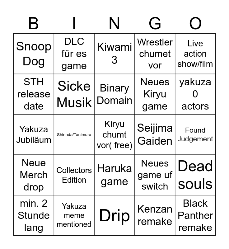 This bingo card has a free space and 24 words: Collectors Edition, Yakuza meme mentioned, Binary Domain, min. 2 Stunde lang, Live action show/film, Snoop Dog, STH release date, DLC für es game, Seijima Gaiden, Haruka game, Neues Kiryu game, Yakuza Jubiläum, Neues game uf switch, Dead souls, Sicke Musik, Kenzan remake, Found Judgement, Kiwami 3, yakuza 0 actors, Shinada/Tanimura, Black Panther remake, Neue Merch drop, Wrestler chumet vor and Drip.