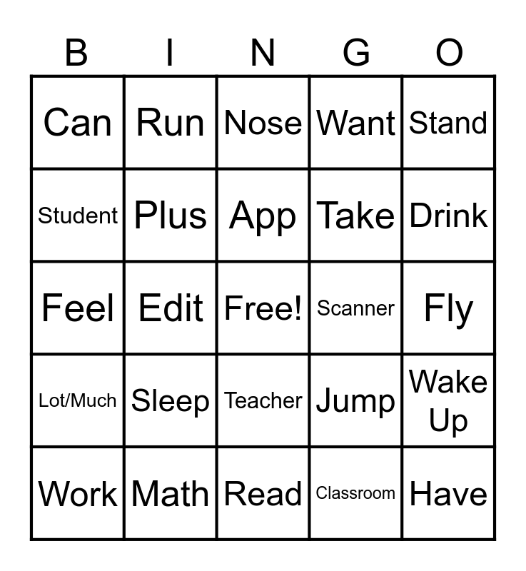 This bingo card has a free space and 71 words: Foot/Feet, Run, Walk, Go, Read, Learn, Want, Like, Take, Give, Work, Help, Drink, Can, Cannot, Feel, Jump, Stand, Have to, Fly, Sleep, Have, Wake Up, Wash, Cry, Pick Up, Love, Open, Close, Stop, Math, Biology, History, Language, Classroom, Class, Subject, Schedule, Student, Study, Teacher, Homework, Lot/Much, Write, Paper, Exam/Test, Minus, Plus, Computer, iPad, Camera, Phone, Scanner, Keyboard, Printer, Charger, App, Chat, Internet, Google, Email, Download, Edit, Wifi, Face, Eyes, Nose, Hair, Body, Head and Back.