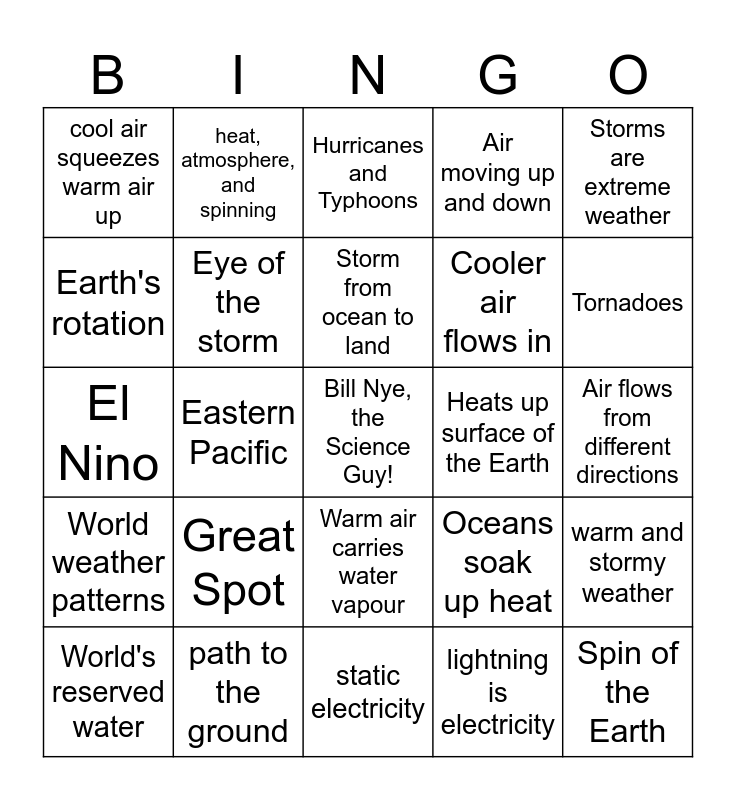 This bingo card has a free space and 29 words: World's reserved water, Negative charge, Eastern Pacific, cold air rushes up, cool air squeezes warm air up, Hurricanes and Typhoons, Eye of the storm, Great Spot, Heats up surface of the Earth, path to the ground, Air flows from different directions, Spin of the Earth, static electricity, lightning is electricity, Tornadoes, strikes highest point, Warm air carries water vapour, World weather patterns, Storms are extreme weather, El Nino, Oceans soak up heat, air masses of different temperatures, Cooler air flows in, Earth's rotation, Air moving up and down, heat, atmosphere, and spinning, warm and stormy weather, Storm from ocean to land and Heats up air and expands fast.