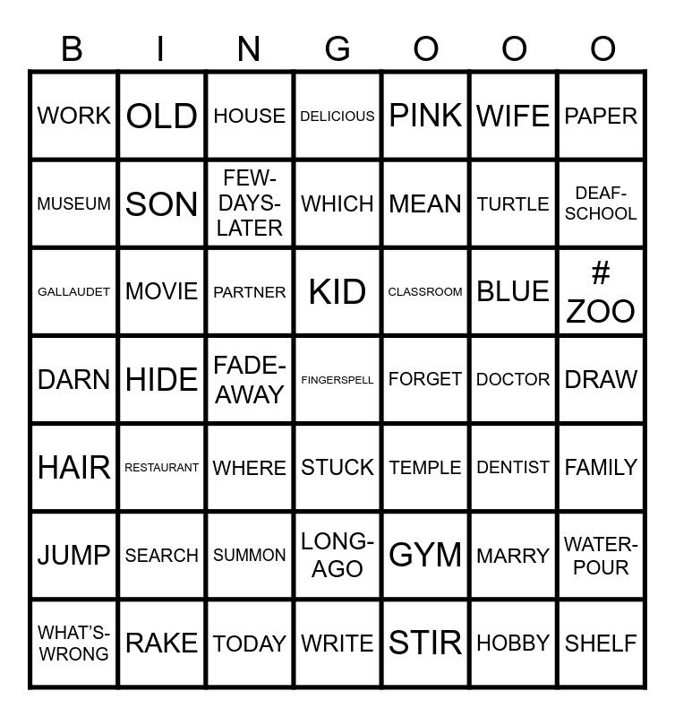 This bingo card has 602 words: Free!, AGAIN, BEARD, BLACK, BLUE, BOOK, BROWN, CHAIR, CLOTHES, COLORS, COPY, CORRECT, DANCE, DIFFERENT, DOOR, DRAW, DRESS, DRESS, FINGERSPELL, FORGET, GLASSES, GRAY, GREEN, HAIR, HAT, HELLO, HI, HOMEWORK, JACKET, JUMP, LETTER, LIGHT, MAN, ME, MEET, MUSTACHE, MY, NAME, NICE, NUMBER, ORANGE, PANTS, PAPER, PERSON, PINK, PURPLE, READ, RED, REMEMBER, SAME, SHAPE, SHIRT, SHOES, SKIRT, SPIN, STAND, TAN, WHAT, WHERE, WHITE, WHO, WINDOW, WOMAN, WRITE, WRITE-DOWN, WRONG, YELLOW, YOU, YOUR#ALL, #NO, #OK-OK, #TV, #YEAR, 16-19, 20-29, AGENT-MARKER, ALL, APPLE, ASL, BE-RAISED, BICYCLE, BOTH, BOWLING, CAMP, CANDY, CHAT, CHOCOLATE, CLASS, COFFEE, COLLEGE, COMPUTER, COOK, DEAF, DOG, DON’T-UNDERSTAND, DRINK, EASY, EAT, ENGLISH, EQUAL, EXCUSE-ME, EXERCISE, FAVORITE, FINE, FISH, FISHING, FRENCH, FS-TAIL, GALLAUDET, GAME, GROSS, HARD, HATE, HAVE, HEAD, HEARING, HERE, HIGH SCHOOL, HOT, HOW-ARE-YOU, HOW-MANY, IX, JUICE, KNITTING, LANGUAGE, LEARN, LIKE, LISTEN, LITTLE-BITLOSE, MANY, MILK, MINUS, MOST, MOVIE, MUSIC, NO, NOT, NOW, OH-I-SEE, OPPOSITE, PAINT, PAY-ATTENTION, PHONE, PICTURE, PLAY, PLUS, READ, RUN, SEE, SEWING, SHOP, SICK, SIGN, SLEEP, SODA/POP, SOME, SORRY, SO-SO, SPANISH, SPEAK, START, STILL, TAKE-PICTURE, TEA, TEACH, THINK, TIE-STRING, TIME, TIRED, TRAVEL, TYPE, UNDERSTAND, VOMIT, WALK, WATCH, WATER, WHICH, WIN, WITH, YES, ZERO(#) HOUR, (#) MINUTE, # BUS, 30-66, ALONE, ALWAYS, ANIMAL, APARTMENT, AREA, ATM, BACKPACK, BIRD, BOX, BOYFRIEND, BUY, CANTON, CAR, CAT DOG, CHEEK-SHOULDER, CHILDREN, CINCINNATI, CITY, CLASSROOM, CLEVELAND, COLUMBUS, COME, CUP, DAUGHTER, DAYTON, DEAF-SCHOOL, DELAWARE, DIRECTION, DISAPPOINTED, DORM, DOWN-TOWN, EAST, ELEVATOR, ENTER, EXIT, EXPLAIN, FAMILY, FATHER, FIND, FINE, FIRST, FISH, FLOOR, FRONT DOOR, GIRLFRIEND, GO-TO, HALLWAY, HIDE, HILL, HOBBY, HOME, HOUR, HOUSE, HOW, HUSBAND, KID, LAB, LARGE, LIBRARY, LIVE, LOBBY, LOOK-FOR, MACHINE, MALL, MEDIUM, MINUTE, MONEY, MOTHER, MOTORCYCLE, MOUNTAIN, NEAR, NEED, NEVERNEW, NONE, NORTH, OFFICE, OLD, OPEN-BACKPACK, PAPER, PARENTS, PARK, PEN, PENCIL, PEOPLE, PET, PICTURE, PLACE, PRACTICE, PROJECTOR, PSHAW, PUT-BEHIND, PUT-BESIDE, PUT-IN, PUT-ON, PUT-UNDER, RABBIT, RAT, RIDE-IN, ROOMATE, RULE, SECOND, SHELF, SHELF, SMALL, SOMETIMES, SON, SOUTH, STAIRS, SUBWAY, SUMMON, TABLE, THANK-YOU, THIRD, TOILET, TOLEDO, TOWN, TRAIN, TRASH, TURTLE, WASH-HANDS, WASTEBASKET, WATER-BODY, WEST, WESTERVILLE, WHICH, WIFE, WORK, WORTHINGTON, YOUNGSTOWN(#)-MONTH OLD, # MONTH OLD, 6 FEET UNDER, ADOPT, AGAIN, ALTOGETHER, AUNT, BE-CLOSE-TO, BECOME-OLD, BE-CONCEIVED, BI, BIRTHDAY, BOY, BROTHER, CELEBRATION, CHRISTMAS, COUSIN, CUTE, DATE, DIE/DEAD, DIED, DIVORCE, ENGAGED, FADE-AWAY, FALL-IN-LOVE, FAMILY-GATHERING, FOR, FOR-FOR, FUTURE, GAY, GIRL, GIVE-BIRTH, GO-STEADY-WITH, GRADUATION, GRANDCHILDREN, GRANDDAUGHTER, GRANDFATHER, GRANDMOTHER, GRANDSON, HALF, HANDSOME, HANUKKAH, HOW-OLD, IN-LAW, INTERESTING, IX, KEY, LAST, LEAVE-FOR, LESBIAN, LOOK-DIFFERENT, LOOK-LIKE, LOOK YOUNG, LOVE, MARRY, MARRY, MAYBE, NEPHEW, NIECE, NOT, NOT-GET-ALONG, OLD-(#), OLD #, OLDEST, ORDINAL 6TH-8TH, OTHER, PARTNER, PASSED-AWAY/GONE, POSS, PREGNANT, PRETTY, PROPOSE, QUARRELQUEER, SEPARATE, SIBLINGS, SICK, SISTER, STEP (FAMILY), STRAIGHT, TAKE-CARE-OF, THANKSGIVING, TRANSGENDER, TWINS, TWO-OF-YOU, UNCLE, US-TWO, VACATION, WANT, WEDDING(#)- WEEK, # BANK, # FIX, # FUN, # POOL, # RENT, # WEEK, # ZOO, ADOPT/HOST, AFTERNOON, ALL-DAY, ALL-NIGHT, AMUSEMENT-PARK, ASK-TO, BABY-SIT, BAR, BASKETBALL, BEACH, BILLS, BRING-TO, BRUSH-TEETH, CAN’T, CELEBRATE, CHECK, CHURCH, CLEAN, CLEAN, CLUB, DARN, DENTIST, DISHES, DOCTOR, DO-DO, DON’T-MIND, DROP OFF, DRUG-STORE, DRY, DUE, DUTY, ENJOY, ENJOY, EVERY-DAY, EXCHANGE/REPLACE, FEED, FINISH, FOLD-CLOTHES, FRIDAY, FRIEND, FUTURE, GAS-FILL, GAS-STATION, GET, GIVE-TO, GO-OUT, GROCERY, GYM, HAIR-CUTS, HATE, HELP, HOSPITAL, HOUSE, INJECTION, JOIN, LINE-UP, MEETING, MONDAY, MONTH, MORNING, MOSQUE, MOVE MOVE-TO, MUSEUM, MUST, NIGHT, NOON, NOT-YET, OIL, ONCE, OUTSIDE, PACK, PARTY, PAST, PAY, PHARMACY, PLANT, POOL (GAME), POOR-YOU, POST-OFFICE, RAKE, REFUSE, RENT, RESTAURANT, SAME-OLD-THING, SATURDAY, SHOW-TO, SIGHT-SEE, SKI, SOCCER, STAY, STUDY, SUN-BATHING, SUNDAY, SWEEP, SWEEP, TAKE-FROM, TELL-TO, TEMPLE, THRICE, THROW-TO, THURSDAY, TODAY, TOMORROW, TRASH, TRIM-HEDGETUESDAY, TWICE, UP-TILL-NOW, US-2, US-3, US-4, US-5, US-ALL, VACUUM, VET, VIDEO-STORE, VISIT, VOLUNTEER, WASH-CLOTHES, WASH-DISHES, WATER-POUR, WEDNESDAY, WEEK, WEEKEND, WEEK-FUTURE, WEEK-PAST, WITHDRAW, WOW, YESTERDAY# HAHA, ALL-ONE-WEEK, AMERICA, ARRIVE, BACKYARD, BATHE, BATHROOM, BEDROOM, BOAT, BROKEN, BUT, CHECK, CHEWING, CHICKENPOX, CLERC, COOKIE, CRY, CURTAINS, DELICIOUS, DINING-ROOM, DRIVE, EGG, ENGLAND, ESTABLISH, EXCITED, FEW-DAYS-LATER, FISH, FRANCE, FRIENDLY, FRONT, GET-DRESSED, GET IN/ON, GHOST, GUM, HUNGRY, HURRY, HURT, KITCHEN, LATER, LAUGH, LONG-AGO, MAD, MEAN, MESSED-UP, MIRROR, NEXT-DAY, ONE-DAY, PLATE, ROOSTER, SANDWICH, SAY, SCARED, SEARCH, SMELL, STIR, STUCK, SWEETHEART, SWELL, TELL-YOU, TENT, TREE, WAIT, WAVE-NO, WHAT’S-WRONG, WORK, WRONG-ME and YELL.