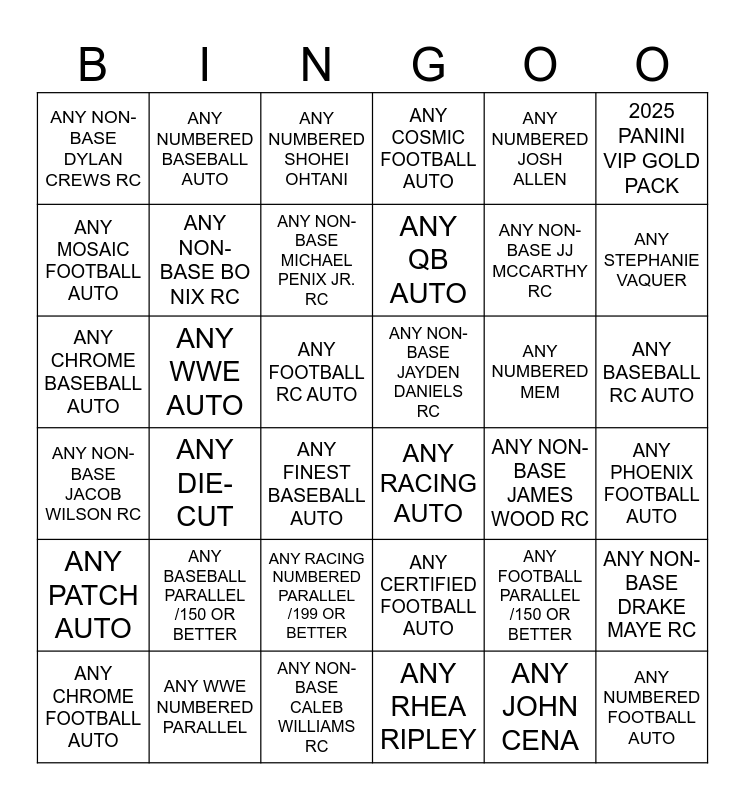 This bingo card has 36 words: ANY CERTIFIED FOOTBALL AUTO, ANY RACING NUMBERED PARALLEL /199 OR BETTER, ANY RHEA RIPLEY, ANY MOSAIC FOOTBALL AUTO, ANY NON-BASE JACOB WILSON RC, ANY NON-BASE JAYDEN DANIELS RC, ANY NON-BASE BO NIX RC, ANY NON-BASE CALEB WILLIAMS RC, ANY NUMBERED JOSH ALLEN, ANY FOOTBALL PARALLEL /150 OR BETTER, ANY STEPHANIE VAQUER, ANY COSMIC FOOTBALL AUTO, ANY NON-BASE DRAKE MAYE RC, ANY WWE AUTO, ANY QB AUTO, ANY NON-BASE DYLAN CREWS RC, ANY PATCH AUTO, ANY NUMBERED MEM, ANY CHROME BASEBALL AUTO, ANY NUMBERED SHOHEI OHTANI, ANY FOOTBALL RC AUTO, ANY DIE-CUT, ANY RACING AUTO, ANY FINEST BASEBALL AUTO, ANY NON-BASE JAMES WOOD RC, ANY NUMBERED BASEBALL AUTO, ANY NON-BASE JJ MCCARTHY RC, ANY WWE NUMBERED PARALLEL, ANY NON-BASE MICHAEL PENIX JR. RC, 2025 PANINI VIP GOLD PACK, ANY NUMBERED FOOTBALL AUTO, ANY CHROME FOOTBALL AUTO, ANY PHOENIX FOOTBALL AUTO, ANY BASEBALL RC AUTO, ANY BASEBALL PARALLEL /150 OR BETTER and ANY JOHN CENA.