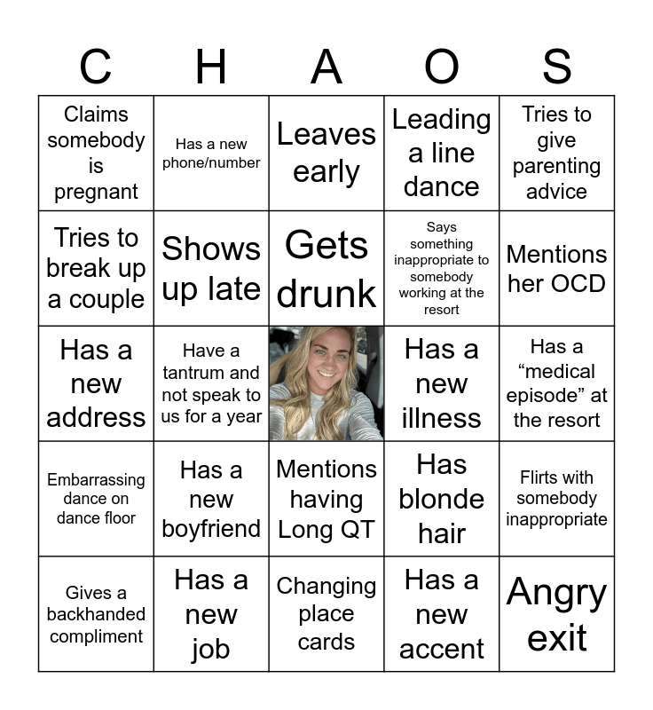 This bingo card has a free space and 24 words: Has a new boyfriend, Has a new job, Gets drunk, Gives a backhanded compliment, Tries to give parenting advice, Claims somebody is pregnant, Tries to break up a couple, Has a new phone/number, Has a new illness, Mentions having Long QT, Says something inappropriate to somebody working at the resort, Has a new address, Has blonde hair, Flirts with somebody inappropriate, Shows up late, Has a new accent, Has a “medical episode” at the resort, Leaves early, Mentions her OCD, Have a tantrum and not speak to us for a year, Angry exit, Embarrassing dance on dance floor, Leading a line dance and Changing place cards.