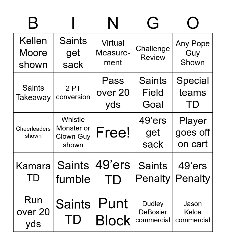 This bingo card has a free space and 24 words: Saints fumble, Saints TD, Pass over 20 yds, Run over 20 yds, Any Pope Guy Shown, Kellen Moore shown, Saints Takeaway, Saints get sack, 49’ers get sack, 49’ers TD, Saints Field Goal, Cheerleaders shown, Saints Penalty, 49’ers Penalty, 2 PT conversion, Dudley DeBosier commercial, Player goes off on cart, Virtual Measure-ment, Special teams TD, Whistle Monster or Clown Guy shown, Jason Kelce commercial, Kamara TD, Challenge Review and Punt Block.