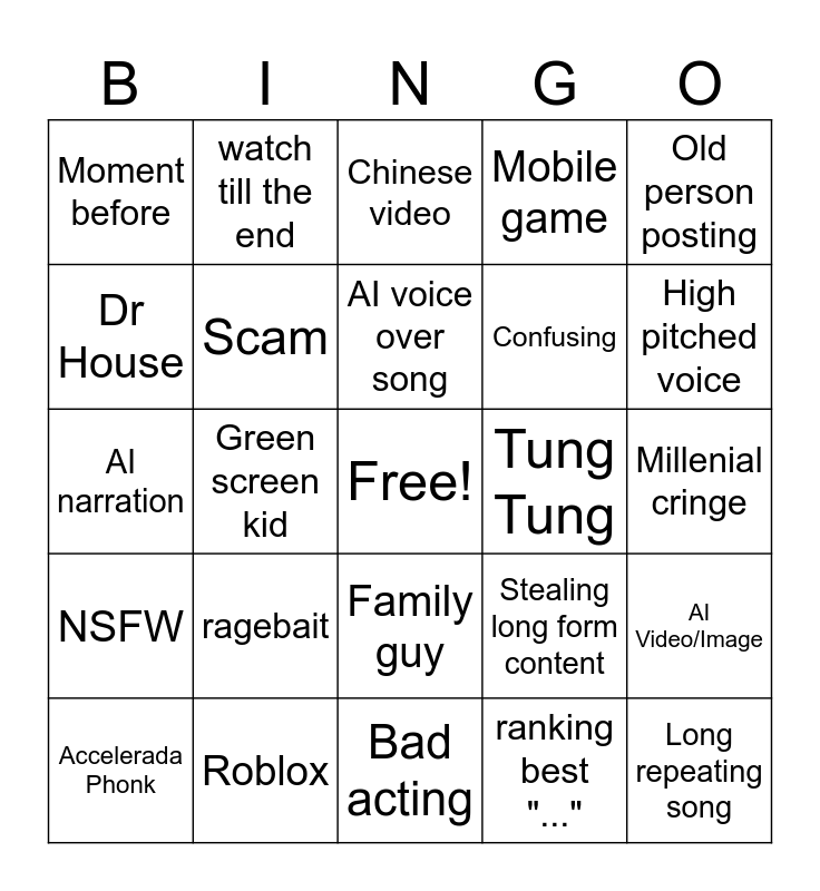 This bingo card has a free space and 24 words: Accelerada Phonk, ragebait, AI voice over song, ranking best "...", Old person posting, Moment before, watch till the end, Chinese video, Tung Tung, Millenial cringe, AI narration, Scam, Stealing long form content, AI Video/Image, Dr House, Roblox, Bad acting, Mobile game, High pitched voice, NSFW, Green screen kid, Family guy, Confusing and Long repeating song.