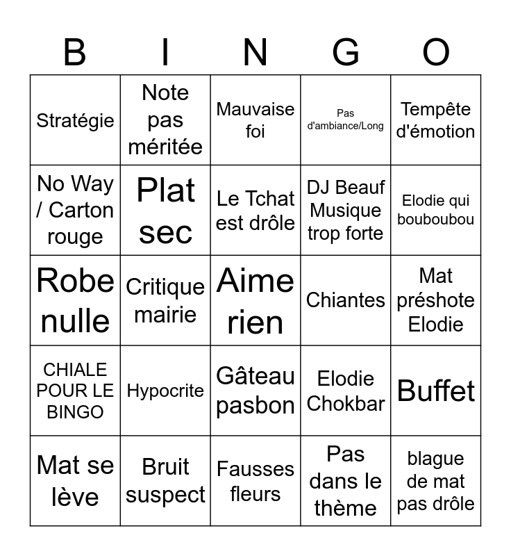 This bingo card has a free space and 24 words: Hypocrite, Bruit suspect, Le Tchat est drôle, Mat se lève, Tempête d'émotion, Stratégie, No Way / Carton rouge, Note pas méritée, Chiantes, Gâteau pasbon, DJ Beauf Musique trop forte, Robe nulle, Elodie Chokbar, Buffet, Plat sec, Pas dans le thème, Mat préshote Elodie, Mauvaise foi, Elodie qui bouboubou, Critique mairie, blague de mat pas drôle, CHIALE POUR LE BINGO, Pas d'ambiance/Long and Fausses fleurs.