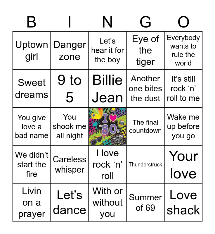 This bingo card has a free space and 64 words: Don’t stop believing, under pressure, I wanna dance with somebody, Your love, Africa, Girls just wanna have fun, Danger zone, Let’s groove, Billie Jean, Like a prayer, I love rock ‘n’ roll, Total eclipse of the heart, Wake me up before you go, Everybody wants to rule the world, Sweet child oh mine, Sweet dreams, You shook me all night, Uptown girl, Maneater, Another one bites the dust, Careless whisper, We didn’t start the fire, Eye of the tiger, Time after time, should I stay or should I go?, Just like heaven, Back in Black, Smooth operator, You make my dreams come true, Dancing in the dark, Everything she wants, Dirty Diana, Beat it, You spin me round, It’s still rock ‘n’ roll to me, Livin on a prayer, Welcome to the jungle, Summer of 69, Crazy little thing called love, 9 to 5, You give love a bad name, The final countdown, Just can’t get enough, Could you be loved?, There is a light that never goes out, Love shack, Let’s dance, Anyway, you want it, Thunderstruck, Footloose, Jessy‘s girl, Who can it be now?, With or without you, Stand and deliver, Break my stride, Dixie and light, Let’s hear it for the boy, Walking on sunshine, Poison, West End girls, It’s tricky, I’ve had the time of my life, True colors and People are people.