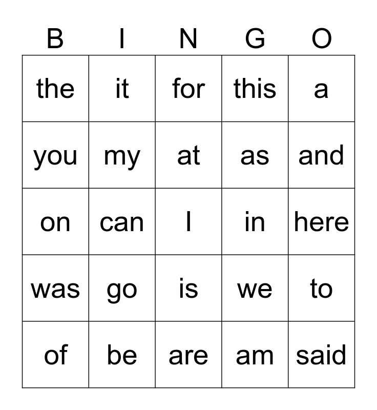 This bingo card has a free space and 24 words: go, be, at, of, a, the, you, it, in, is, as, on, we, to, my, am, here, for, and, can, said, was, this and are.