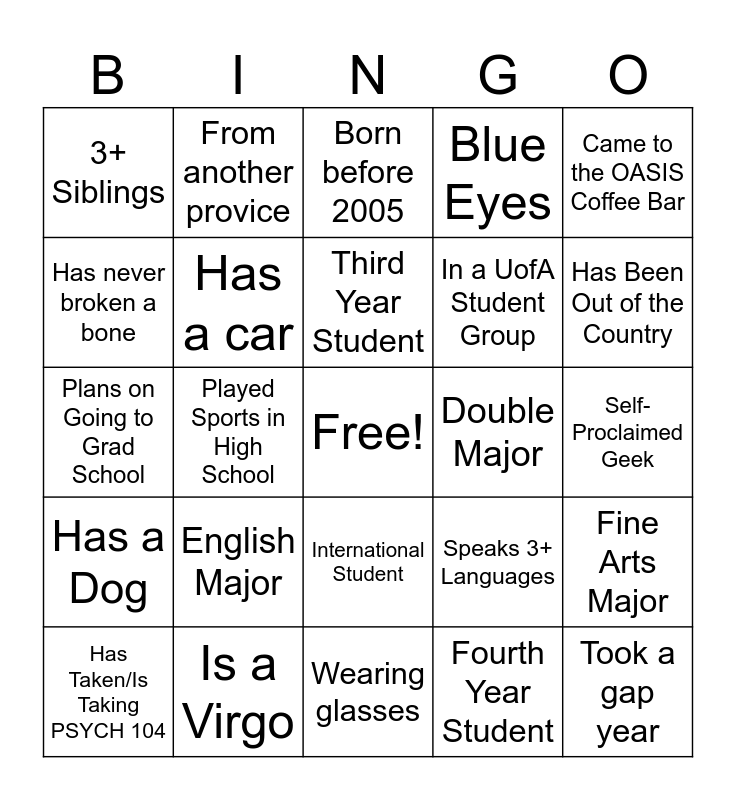 This bingo card has a free space and 49 words: First Year student, Took a gap year, Oldest child, Wearing glasses, English Major, From another country, From another provice, Youngest Child, Has never broken a bone, Left-handed, Has a car, Blue Eyes, Fine Arts Major, Speaks 3+ Languages, Born in Edmonton, Works Full Time, Third Year Student, Double Major, Has a Cat, Came to the OASIS Coffee Bar, Played Sports in High School, Fourth Year Student, 3+ Siblings, In a UofA Student Group, Travelled this Summer, Has Been Out of the Country, Has Taken/Is Taking PSYCH 104, Poli-Sci Major, International Student, Has a Dog, Second Year Student, Can Do a Cartwheel, Is Vegetarian, Has An Allergy, Is a Virgo, Is a Aries, Is a Aquarius, Plays an instrument, Self-Proclaimed Geek, No Siblings, Born in the Winter, Born in the Summer, Honours Student, Lives/Has Lived in Residence, Plans on Going to Grad School, Born before 2005, Born after 2005, Can keep a plant alive and Loves to read.