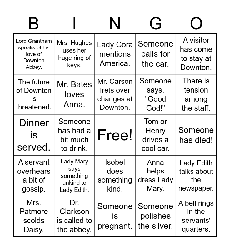 This bingo card has a free space and 24 words: Mrs. Patmore scolds Daisy., Lady Mary says something unkind to Lady Edith., Mr. Carson frets over changes at Downton., Someone polishes the silver., A visitor has come to stay at Downton., Lord Grantham speaks of his love of Downton Abbey., Mrs. Hughes uses her huge ring of keys., Lady Cora mentions America., Tom or Henry drives a cool car., Someone has died!, Dinner is served., Mr. Bates loves Anna., Anna helps dress Lady Mary., Lady Edith talks about the newspaper., The future of Downton is threatened., Dr. Clarkson is called to the abbey., Someone is pregnant., Someone calls for the car., There is tension among the staff., A servant overhears a bit of gossip., Someone has had a bit much to drink., Isobel does something kind., Someone says, "Good God!" and A bell rings in the servants' quarters..