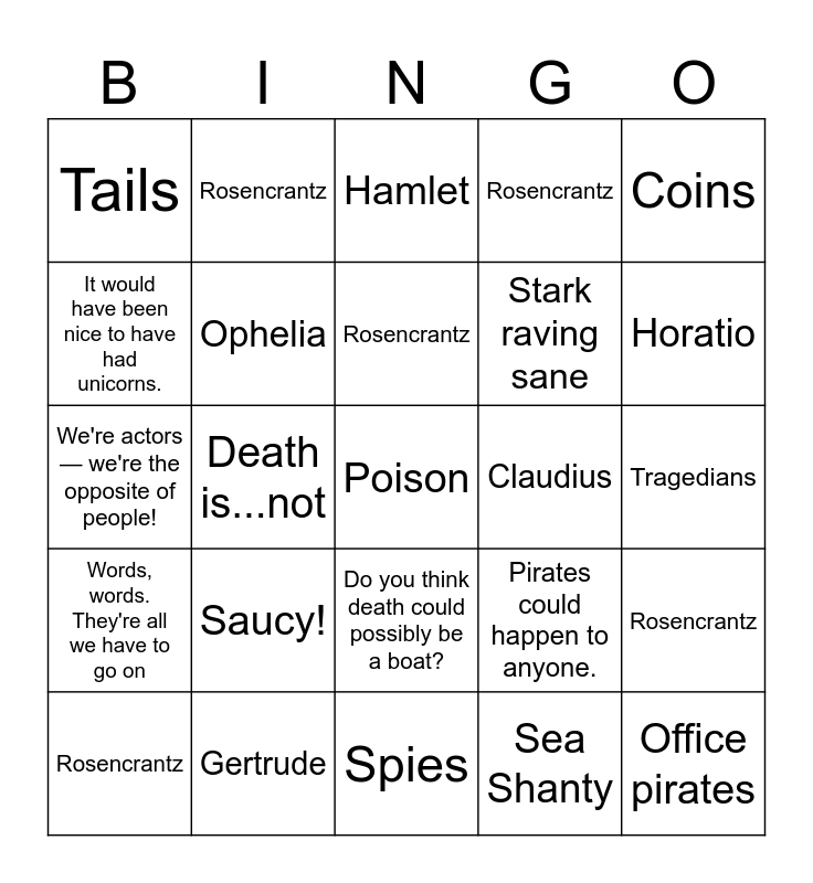 This bingo card has a free space and 29 words: Rosencrantz, Guildenstern, Death is...not, Heads, Tails, Hamlet, Ophelia, Saucy!, Claudius, Gertrude, Tragedians, Office pirates, Spies, Sea Shanty, Horatio, The Player, Do you think death could possibly be a boat?, Words, words. They're all we have to go on, Coins, We're actors — we're the opposite of people!, Pirates could happen to anyone., I don't believe in it anyway. What? England., Stark raving sane, It would have been nice to have had unicorns., Rosencrantz, Rosencrantz, Rosencrantz, Rosencrantz and Rosencrantz.