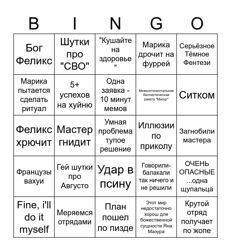 This bingo card has 25 words: Гей шутки про Августо, План пошел по пизде, Одна заявка - 10 минут мемов, Fine, i'll do it myself, Серьёзное Тёмное Фентези, Бог Феликс, Марика пытается сделать ритуал, Шутки про "СВО", Иллюзии по приколу, Удар в псину, Межконтинентальная баллистическая ракета "Мазур", Феликс хрючит, Говорили-балакали так ничего и не решили, ОЧЕНЬ ОПАСНЫЕ ...одна щупальца, 5+ успехов на хуйню, Крутой отряд получает по жопе, Загнобили мастера, "Кушайте на здоровье ", Ситком, Мастер гнидит, Умная проблема тупое решение, Меряемся отрядами, Французы вахуи, Марика дрочит на фуррей and Этот мир недостаточно хорош для божественной сущности Яна Мазура.