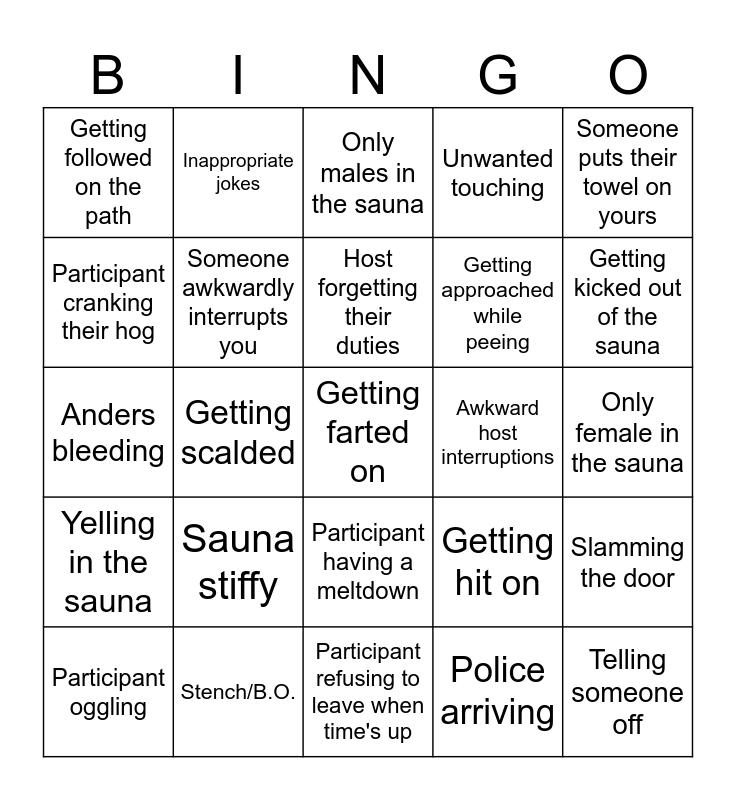 This bingo card has a free space and 24 words: Sauna stiffy, Stench/B.O., Host forgetting their duties, Participant oggling, Someone puts their towel on yours, Getting followed on the path, Participant cranking their hog, Inappropriate jokes, Awkward host interruptions, Participant having a meltdown, Getting approached while peeing, Anders bleeding, Getting hit on, Slamming the door, Someone awkwardly interrupts you, Police arriving, Only female in the sauna, Only males in the sauna, Getting kicked out of the sauna, Getting scalded, Telling someone off, Yelling in the sauna, Unwanted touching and Participant refusing to leave when time's up.