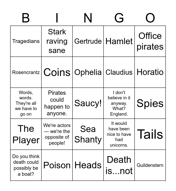 This bingo card has a free space and 24 words: We're actors — we're the opposite of people!, Poison, Ophelia, Do you think death could possibly be a boat?, Office pirates, Tragedians, Rosencrantz, Stark raving sane, I don't believe in it anyway. What? England., Sea Shanty, Claudius, Words, words. They're all we have to go on, It would have been nice to have had unicorns., Tails, Coins, Death is...not, Spies, Gertrude, Horatio, Pirates could happen to anyone., Guildenstern, The Player, Hamlet and Heads.