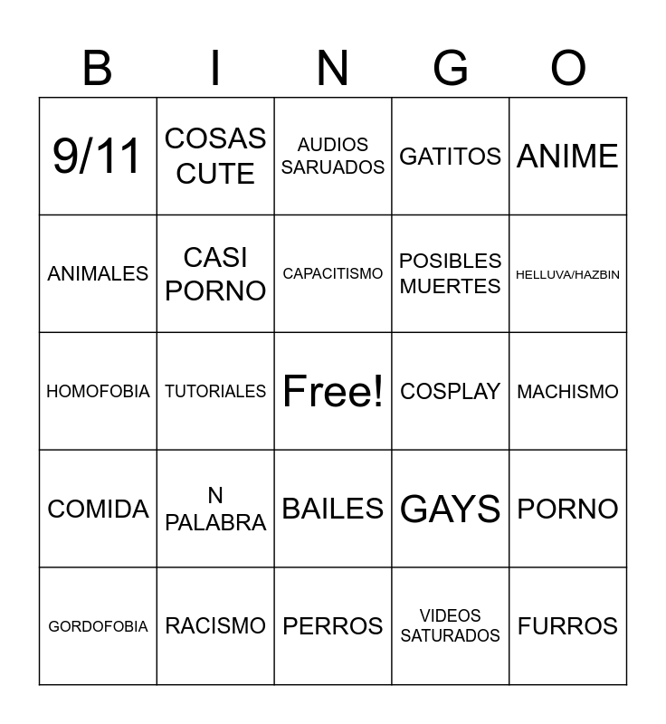 This bingo card has a free space and 24 words: N PALABRA, RACISMO, CAPACITISMO, GORDOFOBIA, ANIME, 9/11, ANIMALES, COSAS CUTE, COSPLAY, BAILES, POSIBLES MUERTES, HOMOFOBIA, GAYS, PORNO, CASI PORNO, VIDEOS SATURADOS, MACHISMO, AUDIOS SARUADOS, HELLUVA/HAZBIN, TUTORIALES, FURROS, COMIDA, GATITOS and PERROS.