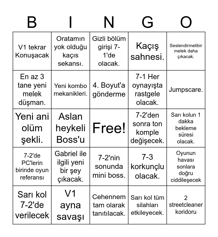 This bingo card has a free space and 24 words: Gabriel ile ilgili yeni bir şey çıkacak., V1 ayna savaşı, 4. Boyut'a gönderme, Sarı kol 7-2'de verilecek, Seslendirmelibir melek daha çıkacak., V1 tekrar Konuşacak, En az 3 tane yeni melek düşman., Oratamın yok olduğu kaçıs sekansı., 7-2'den sonra ton komple değişecek., 7-2'nin sonunda mini boss., 7-1 Her oynayışta rastgele olacak., Yeni ani olüm şekli., 7-3 korkunçlu olacak., Oyunun havası sonlara doğru ciddileşecek, Yeni kombo mekanikleri., Sarı kol tüm silahları etkileyecek., Sarı kolun 1 dakka bekleme süresi olacak., Gizli bölüm girişi 7-1'de olacak., Jumpscare., Aslan heykeli Boss'u, 2 streetcleaner koridoru, 7-2'de PC'lerin birinde oyun referansı, Kaçış sahnesi. and Cehennem tam olarak tanıtılacak..