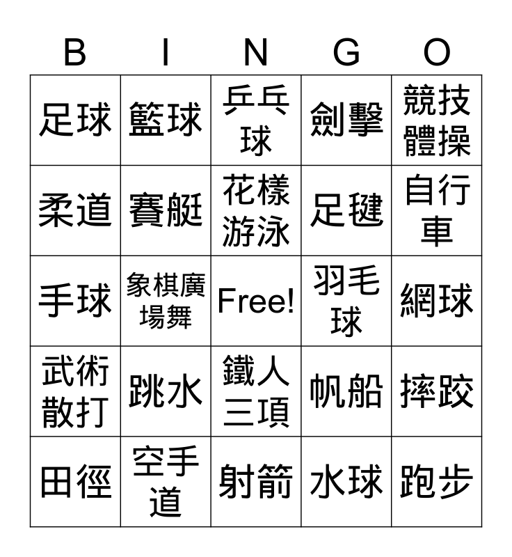 This bingo card has a free space and 24 words: 田徑, 跳水, 花樣游泳, 水球, 競技體操, 足球, 籃球, 乒乓球, 羽毛球, 網球, 手球, 賽艇, 帆船, 摔跤, 柔道, 空手道, 射箭, 劍擊, 自行車, 武術散打, 象棋廣場舞, 鐵人三項, 足毽 and 跑步.