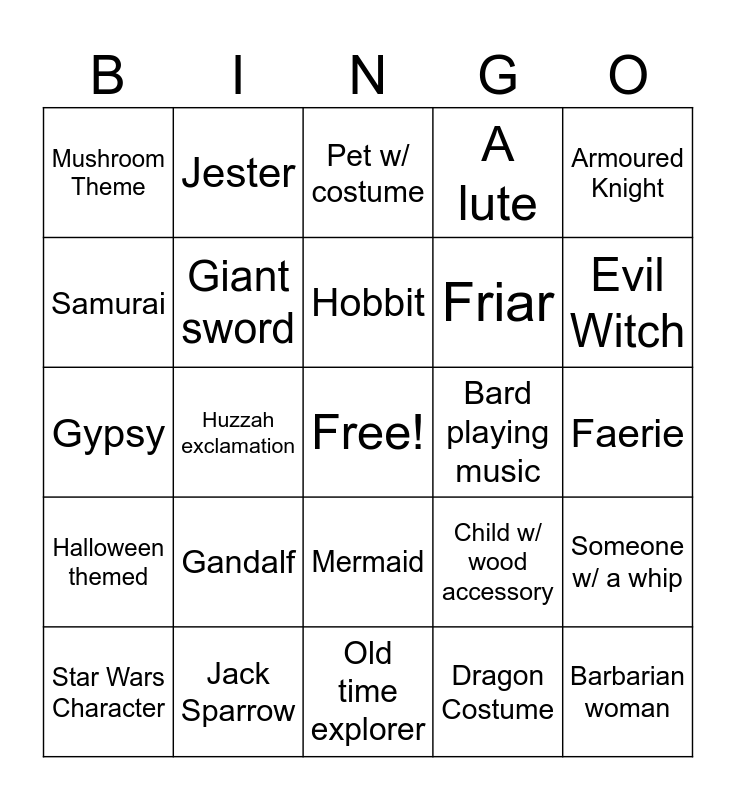 This bingo card has a free space and 24 words: Gandalf, Jack Sparrow, Hobbit, Star Wars Character, Armoured Knight, Mushroom Theme, Samurai, Jester, Bard playing music, Mermaid, Friar, Gypsy, Child w/ wood accessory, Someone w/ a whip, Giant sword, Dragon Costume, Faerie, Pet w/ costume, Evil Witch, Huzzah exclamation, Barbarian woman, Halloween themed, A lute and Old time explorer.