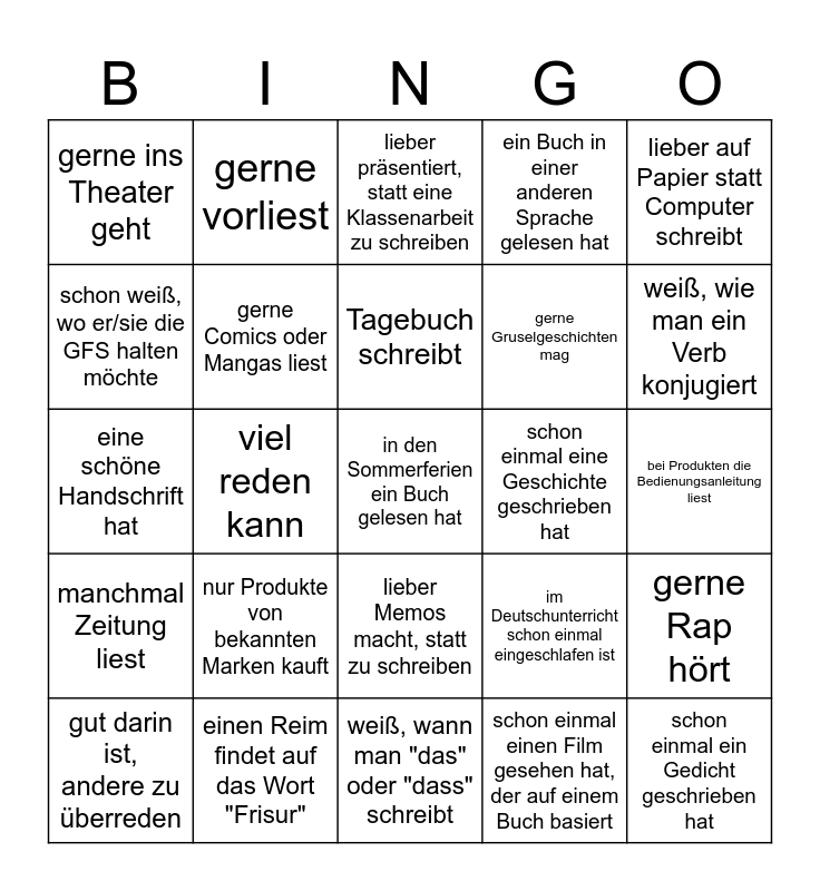 This bingo card has a free space and 24 words: nur Produkte von bekannten Marken kauft, einen Reim findet auf das Wort "Frisur", Tagebuch schreibt, gut darin ist, andere zu überreden, lieber auf Papier statt Computer schreibt, gerne ins Theater geht, schon weiß, wo er/sie die GFS halten möchte, gerne vorliest, schon einmal eine Geschichte geschrieben hat, lieber Memos macht, statt zu schreiben, gerne Gruselgeschichten mag, eine schöne Handschrift hat, im Deutschunterricht schon einmal eingeschlafen ist, gerne Rap hört, gerne Comics oder Mangas liest, schon einmal einen Film gesehen hat, der auf einem Buch basiert, bei Produkten die Bedienungsanleitung liest, lieber präsentiert, statt eine Klassenarbeit zu schreiben, weiß, wie man ein Verb konjugiert, viel reden kann, schon einmal ein Gedicht geschrieben hat, manchmal Zeitung liest, ein Buch in einer anderen Sprache gelesen hat and weiß, wann man "das" oder "dass" schreibt.