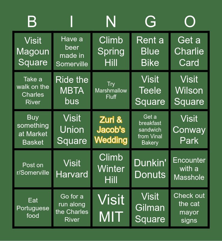 This bingo card has a free space and 50 words: Take a walk on the community path, Check out the cat mayor signs, Try MEM tea, Visit MIT, Visit Harvard, Bow Market, Have a beer made in Somerville, Have a beer made in Cambridge, Take a walk on the Charles River, Ride the T, Ride the MBTA bus, Rent a Blue Bike, Encounter with a Masshole, Dunkin' Donuts, Tatte, Life Alive, Try Marshmallow Fluff, Get a breakfast sandwich from Vinal Bakery, Get coffee at Broadsheet, Get a Charlie Card, Visit Union Square, Visit Gilman Square, Visit Magoun Square, Visit Teele Square, Visit Ball Square, Visit Powder House Square, Visit Wilson Square, Climb Central Hill, Climb Spring Hill, Climb Winter Hill, Climb Prospect Hill, Visit the Union Square Farmers Market, Visit the Davis Square Flea Market, Go for a run on the community path, Go for a run along the Charles River, Endless courage sticker, Gracie's ice cream sticker, NOT ART, Visit Lincoln Park, Visit Conway Park, Visit a pocket park, Eat a lobster roll, Speak to someone in Portuguese, Eat Brazilian food, Eat Portuguese food, Buy something at Market Basket, Buy something at Dark Star (Beacon St. Star Market), Browse r/Somerville, Post on r/Somerville and Have a beer made in Massachusetts.