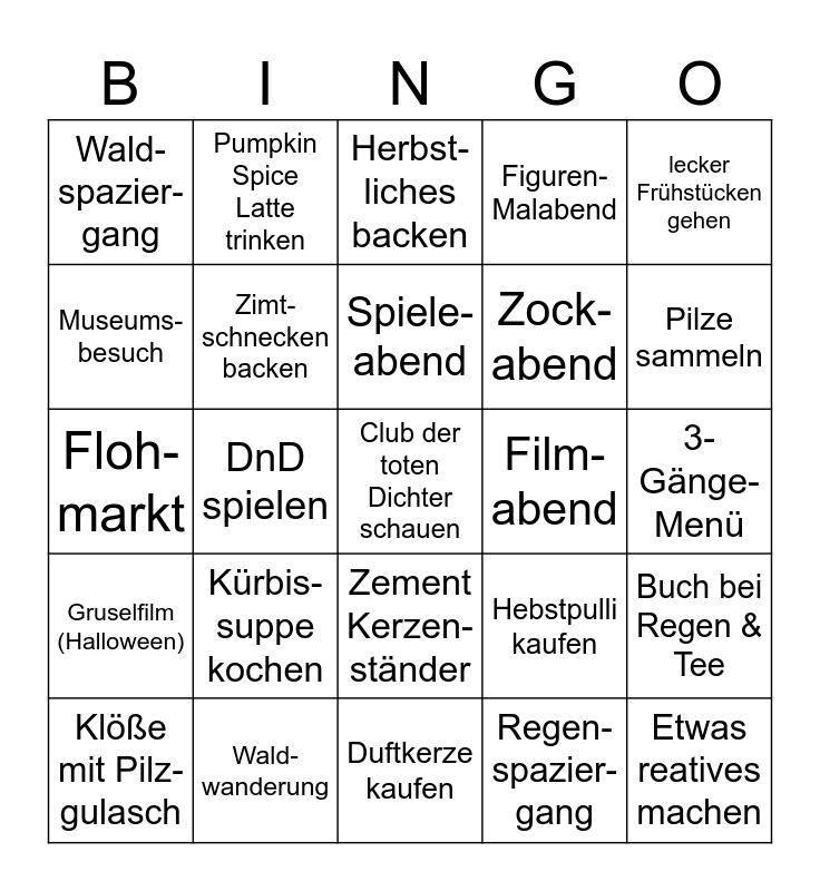 This bingo card has 25 words: Kürbis- suppe kochen, Duftkerze kaufen, Spiele-abend, Klöße mit Pilz-gulasch, lecker Frühstücken gehen, Wald-spazier-gang, Museums-besuch, Pumpkin Spice Latte trinken, Film-abend, Zement Kerzen-ständer, Zock-abend, Floh-markt, Hebstpulli kaufen, Buch bei Regen & Tee, Zimt- schnecken backen, Etwas reatives machen, 3-Gänge-Menü, Herbst-liches backen, Pilze sammeln, DnD spielen, Club der toten Dichter schauen, Wald-wanderung, Gruselfilm (Halloween), Figuren-Malabend and Regen-spazier-gang.