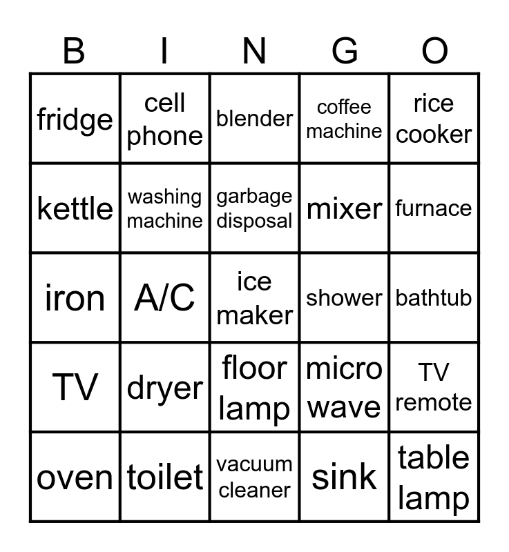This bingo card has a free space and 29 words: oven, dish washer, A/C, water heater, fridge, blender, washing machine, dryer, shower, toilet, bathtub, table lamp, vacuum cleaner, sink, furnace, ceiling fan, floor lamp, TV, rice cooker, iron, micro wave, toaster, mixer, kettle, coffee machine, cell phone, TV remote, garbage disposal and toaster oven.