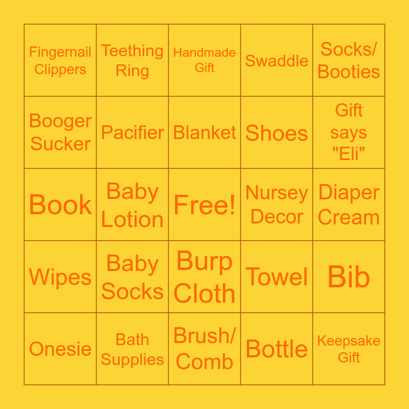 This bingo card has a free space and 32 words: Bottle, Toys, Baby Lotion, Diapers, Wipes, Pacifier, Socks/ Booties, Bib, Teething Ring, Breast Feeding Supplies, Blanket, Handmade Gift, Clothes, Hat, Nursey Decor, Swing/ Bouncer, Onesie, Book, Burp Cloth, Baby Socks, Towel, Stuffed Animal, Diaper Cream, Bath Supplies, Keepsake Gift, Swaddle, Shoes, Booger Sucker, Fingernail Clippers, Brush/ Comb, Baby Dishes and Gift says "Eli".
