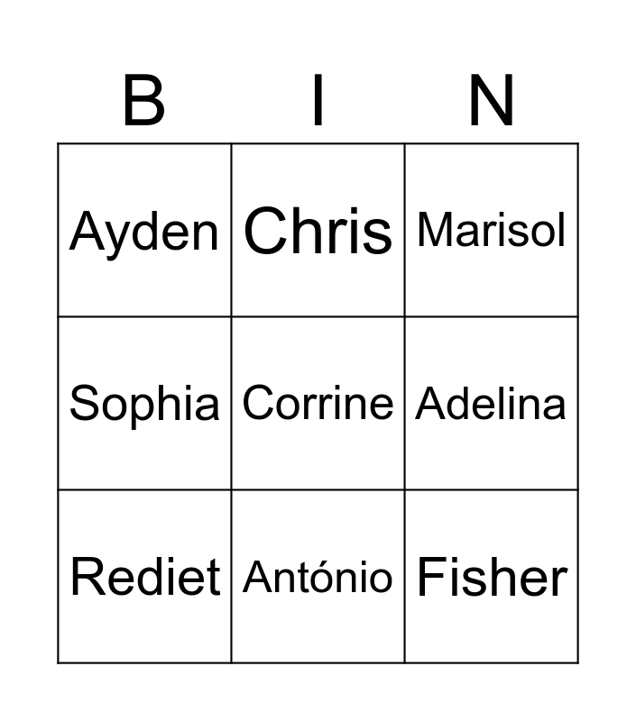 This bingo card has 23 words: Aadhav, Abraham, António, Athena, Corrine, Ayden, Adelina, Chris, Calie, Drayden, Faith, Fisher, Gelila, Giorgette, John, Kean, Marisol, Mariamawit, Rediet, Sania, Sophia, Waverley and Zander.