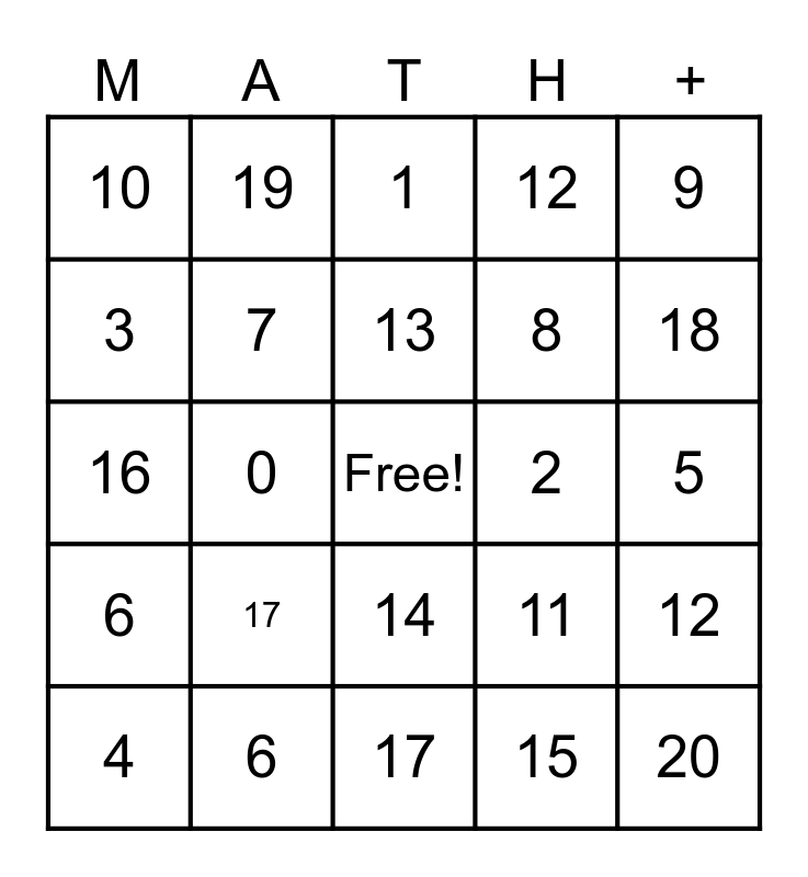 This bingo card has a free space and 24 words: 17, 6, 13, 4, 9, 10, 3, 19, 2, 14, 8, 16, 11, 12, 7, 15, 5, 1, 18, 0, 20, 6, 12 and 17.