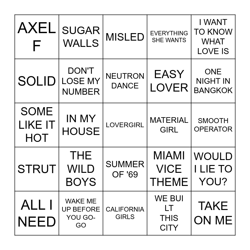 This bingo card has 56 words: A VIEW TO A KILL, ALL I NEED, ALL SHE WANTS TO DO IS DANCE, AXEL F, CALIFORNIA GIRLS, COOL IT NOW, DON'T LOSE MY NUMBER, DON'T YOU (FORGET ABOUT ME), EASY LOVER, EVERYBODY WANTS TO RULE THE WORLD, EVERYTHING SHE WANTS, FREEDOM! 90, FREEWAY OF LOVE, FRESH, GLORY DAYS, I FEEL FOR YOU, I WANT TO KNOW WHAT LOVE IS, IN MY HOUSE, JUNGLE LOVE, LOVERGIRL, MATERIAL GIRL, METHOD OF MODERN LOVE, MIAMI VICE THEME, MISLED, MONET FOR NOTHING, NEUTRON DANCE, NEVER SURRENDER, OBSESSION, ONE NIGHT IN BANGKOK, PART-TIME LOVER, RASPBERRY BERET, RHYTHM OF THE NIGHT, RUN TO YOU, SHOUT, SMOOTH OPERATOR, SOLID, SOME LIKE IT HOT, ST. ELMO'S FIRE, STRUT, SUGAR WALLS, SUMMER OF '69, TAKE ON ME, THE BOYS OF SUMMER, THE HEAT IS ON, THE POWER OF LOVE, THE WILD BOYS, WAKE ME UP BEFORE YOU GO-GO, WALKING ON SUNSHINE, WE ARE THE WORLD, WE BELONG, WE BUILT THIS CITY, WE DON'T NEED ANOTHER HERO (THUNDERDOME), WHAT ABOUT LOVE?, WHO'S ZOOMIN' WHO?, WOULD I LIE TO YOU? and YOU BELONG TO THE CITY.