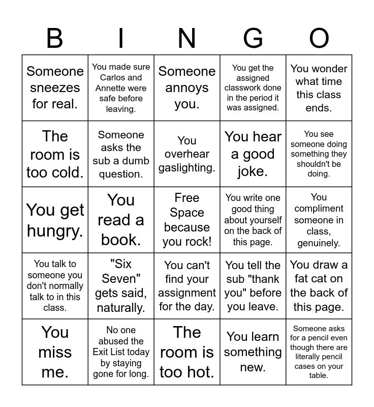 This bingo card has a free space and 24 words: "Six Seven" gets said, naturally., No one abused the Exit List today by staying gone for long., You overhear gaslighting., You miss me., You wonder what time this class ends., Someone sneezes for real., The room is too cold., You made sure Carlos and Annette were safe before leaving., You write one good thing about yourself on the back of this page., You can't find your assignment for the day., You hear a good joke., You get hungry., You tell the sub "thank you" before you leave., You draw a fat cat on the back of this page., Someone asks the sub a dumb question., You learn something new., You compliment someone in class, genuinely., Someone annoys you., You see someone doing something they shouldn't be doing., You read a book., Someone asks for a pencil even though there are literally pencil cases on your table., You talk to someone you don't normally talk to in this class., You get the assigned classwork done in the period it was assigned. and The room is too hot..