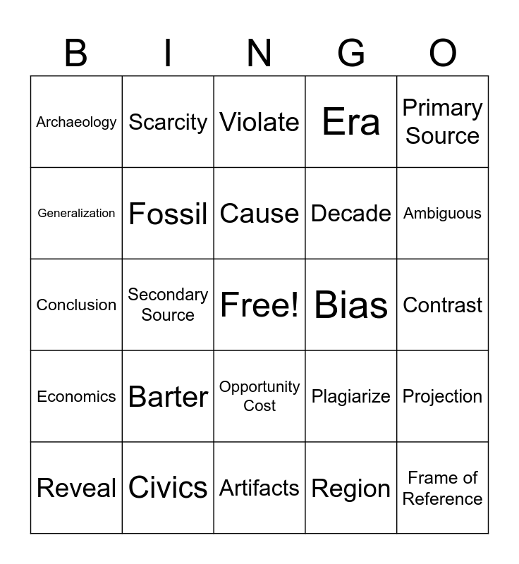 This bingo card has a free space and 57 words: Continuity, Reveal, Context, Archaeology, Artifacts, Paleontology, Fossil, Anthropology, Decade, Century, Era, Chronology, Time Line, Source, Relevant, Evidence, Primary Source, Secondary Source, Point of View, Frame of Reference, Bias, Credential, Plagiarize, Violate, Interpret, Cause, Effect, Logical, Ambiguous, Generate, Sequencing, Main Idea, Category, Comparison, Contrast, Generalization, Inference, Conclusion, Social Studies, Economics, Scarcity, Opportunity Cost, Supply, Demand, Export, Import, Barter, Civics, Geography, Absolute Location, Relative Location, Region, Hemisphere, Latitude, Longitude, Projection and Cardinal Direction.