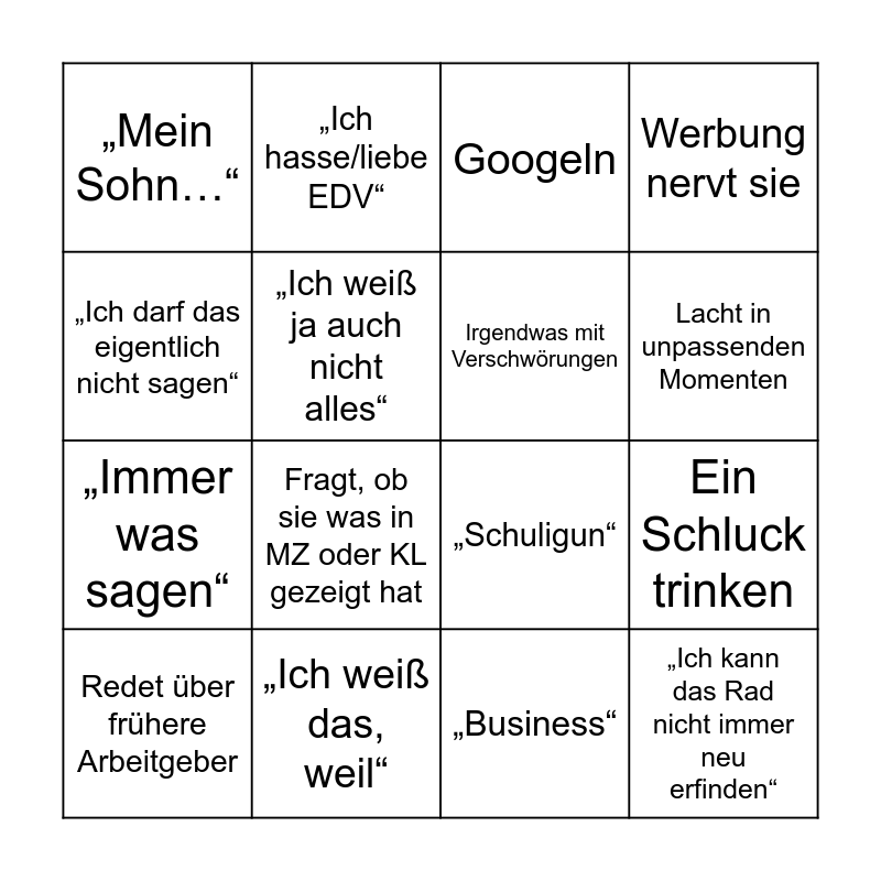 This bingo card has 16 words: „Ich weiß das, weil“, Ein Schluck trinken, Googeln, „Mein Sohn…“, „Immer was sagen“, „Ich hasse/liebe EDV“, „Schuligun“, „Business“, „Ich darf das eigentlich nicht sagen“, „Ich weiß ja auch nicht alles“, Redet über frühere Arbeitgeber, Werbung nervt sie, Fragt, ob sie was in MZ oder KL gezeigt hat, Lacht in unpassenden Momenten, Irgendwas mit Verschwörungen and „Ich kann das Rad nicht immer neu erfinden“.