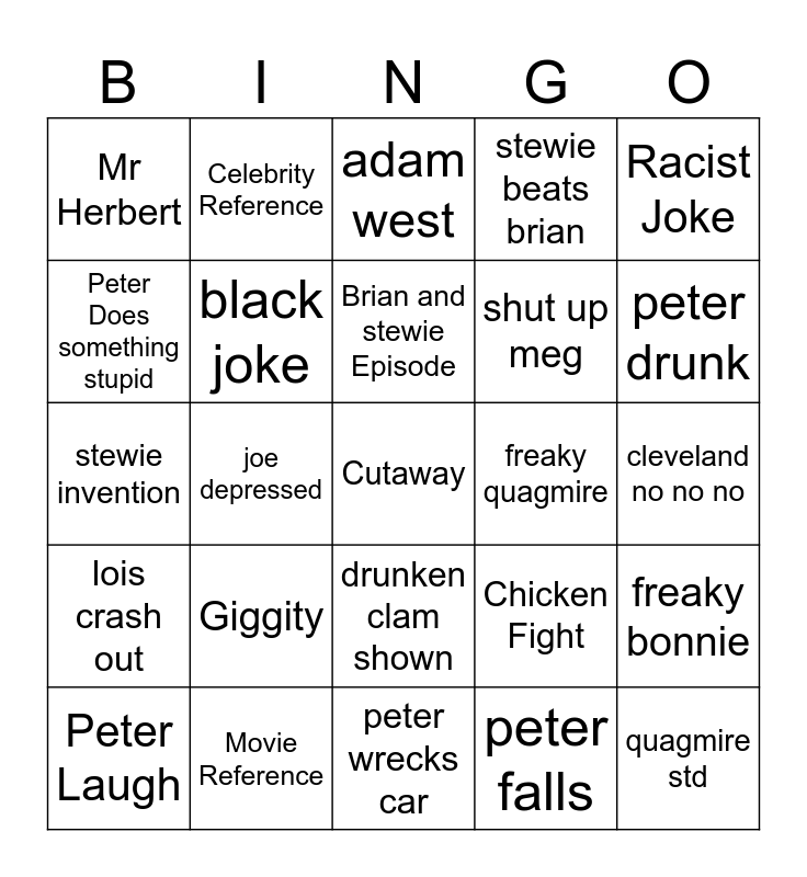 This bingo card has a free space and 24 words: Giggity, Movie Reference, Brian and stewie Episode, Peter Laugh, Racist Joke, Mr Herbert, Peter Does something stupid, Celebrity Reference, freaky quagmire, drunken clam shown, shut up meg, stewie invention, Chicken Fight, freaky bonnie, black joke, peter falls, cleveland no no no, adam west, peter drunk, joe depressed, quagmire std, lois crash out, stewie beats brian and peter wrecks car.