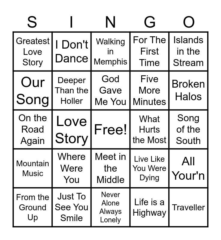 This bingo card has a free space and 66 words: God's Country, The House That Built Me, Follow You to Virgie, All Your'n, Lady May, My Wish, I Don't Dance, Wagon Wheel, God Gave Me You, Wagon Wheel, Meet in the Middle, Sold, Song of the South, Islands in the Stream, I Can Love You Like That, Our Song, Love Story, Greatest Love Story, When I Get Where I'm Going, Five More Minutes, Where Were You, Mountain Music, For The First Time, Dirt On My Boots, Blue Ain't Your Color, Tin Man, The Rest of Our Life, Better Man, Traveller, Legends, From the Ground Up, My Little Girl, My Best Friend, 9-5, Live Like You Were Dying, Just To See You Smile, Automatic, On the Road Again, Life is a Highway, Livin on Love, Deeper Than the Holler, Better Dig Two, What Hurts the Most, You are my Sunshine, International Harvester, If Your Gonna Play In Texas, Broken Halos, Millionaire, Mean, American Soldier, I Never Lie, Buy Dirt, I Love a Rainy Night, Every Light in the House, The Painter, One More Day, Find Out Who Your Friends Are, John Deere Green, Walking in Memphis, Never Alone Always Lonely, I Walk the Line, Fishin' in the Dark, Keep the Wolves Away, Ain't No Love in Oklahoma, Roll On and It's A Great Day To Be Alive.